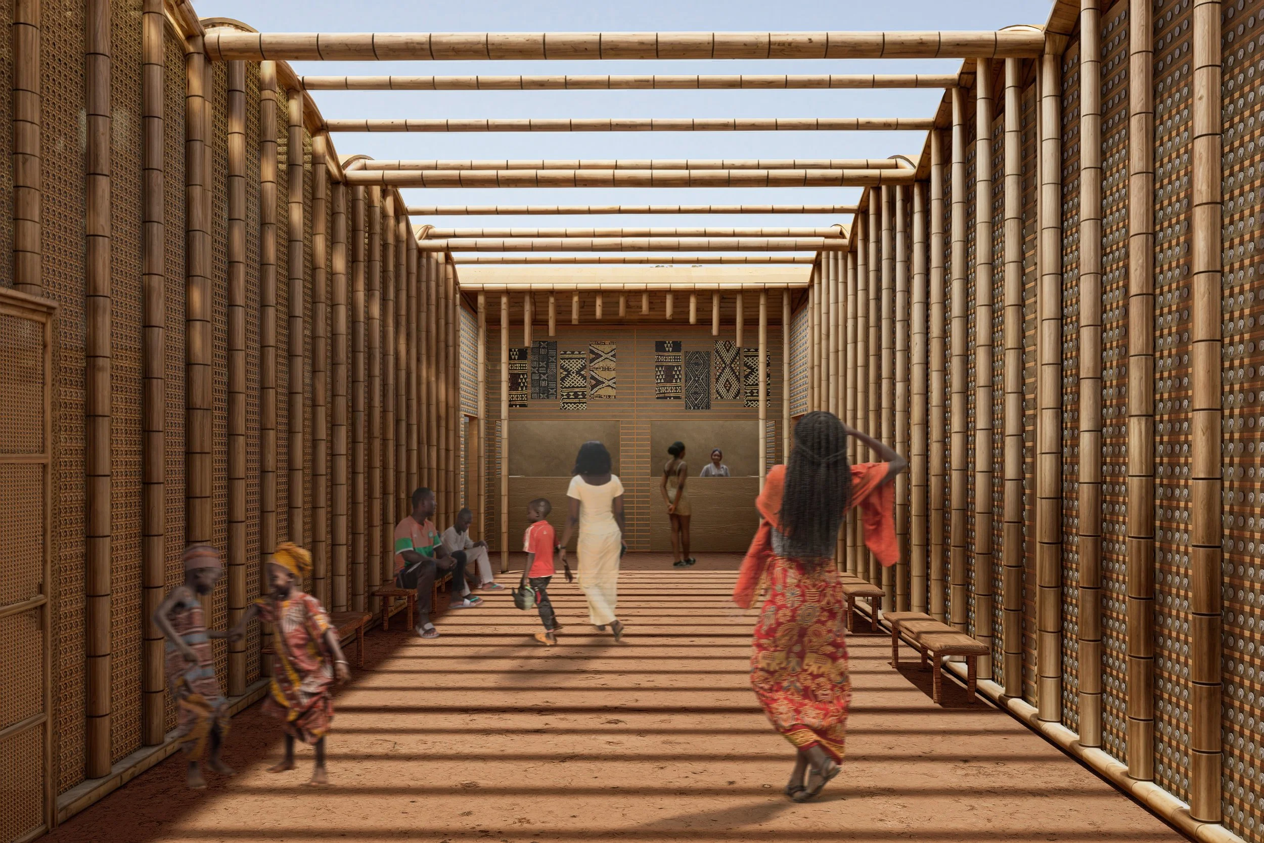 The screen is created through the application of the bamboo and straw components. We recognized the bamboo can double as a vertical post and as structure for the roof framing. The straw acts as twine at locations where bamboo pieces connect and also acts as another layer of screening where necessary. As we recognize the straw finish cannot fully shield water in roofing conditions we introduced a layer above the bamboo structure below the straw, of plastic derived from local waste material that can be washed and laid down as a layer of waterproofing.