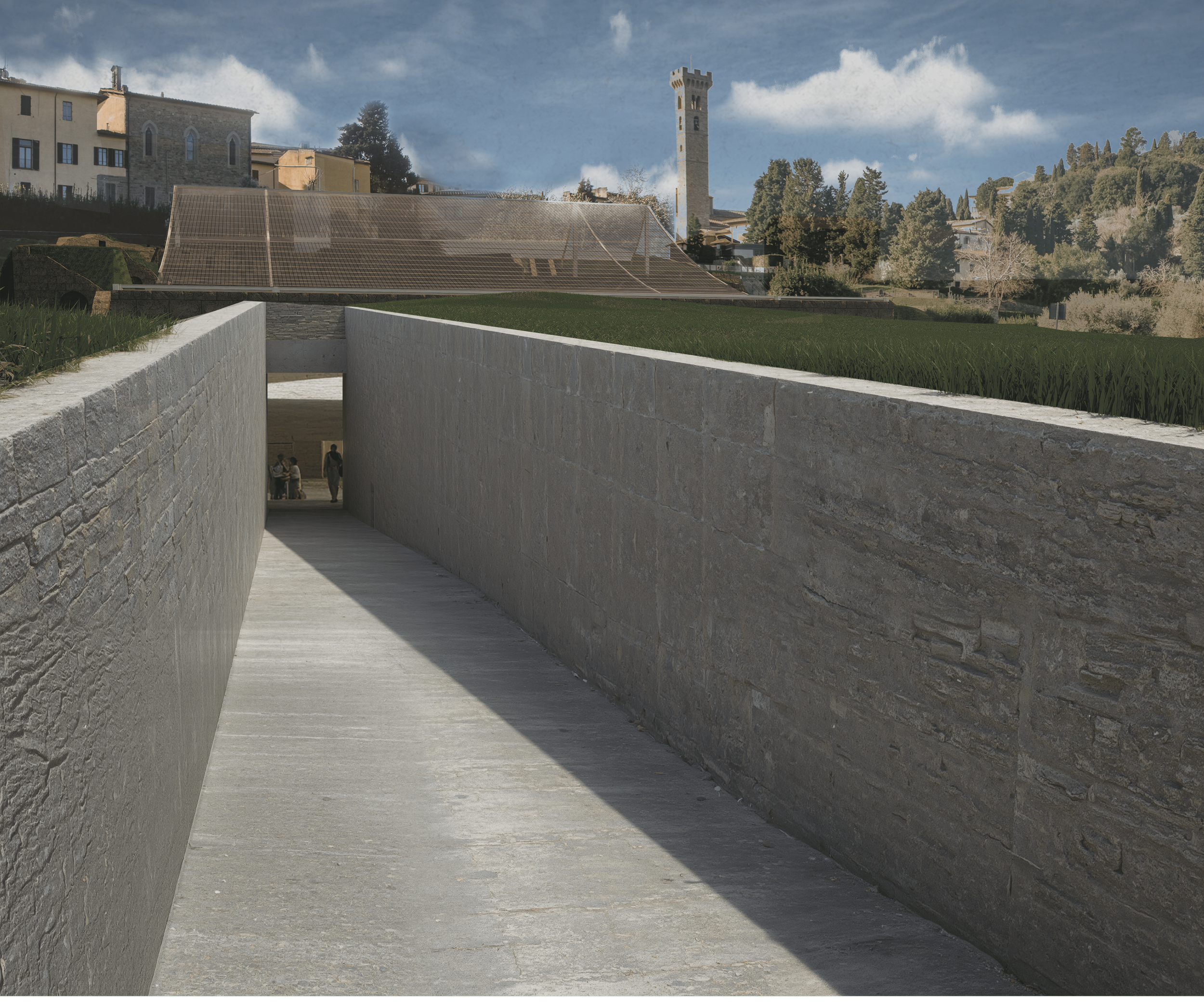At the core of the design is the dialogue between the museum and the roof. These two new elements are conceived within a rectangular plan and mirror each other in form and alignment, yet occupy different vertical planes—the roof elevated above ground, and the museum embedded below. This duality embodies the idea of a structural and symbolic bridge between past and present, concealment and revelation.